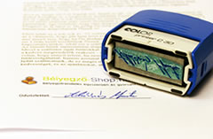 Milyen gondok származhatnak ebből? Ha illetéktelen aláír a bélyegzőjével, és az a dokumentum fénymásolásra kerül, akkor már nem állapítható meg, hogy az aláírás eredeti-e? Az eredeti papíron látszik, hogy a lenyomatot bélyegző készítette: nincsenek meg a golyóstolltól származó mélyedések-vonalak a papíron, a lenyomat is túl egyenletes egy valódi kézzel írott aláíráshoz képest. De ne adjon még esélyt sem arra, hogy megpróbáljon bárki visszaélni ezzel.